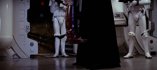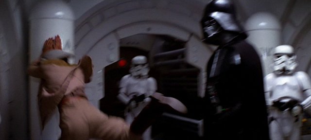 Dziś podwójna wpadka w jednej scenie. Nogi szturmowców zmieniają położenie z ujęcia na ujęcie, a martwy oficer rzucony na ścianę przez Vadera zasłania twarz rękami przed uderzeniem 😉 . (nad. Gigacz)