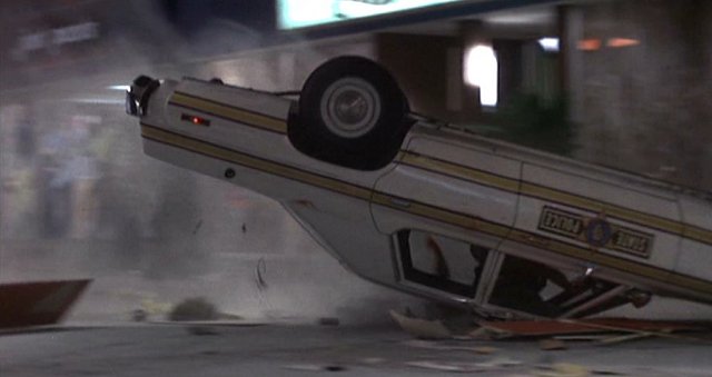 Zależnie od ujęcia radiowóz leży do góry kołami trąc o ziemię dachem i maską, albo samym dachem ;). (nad. Dux)