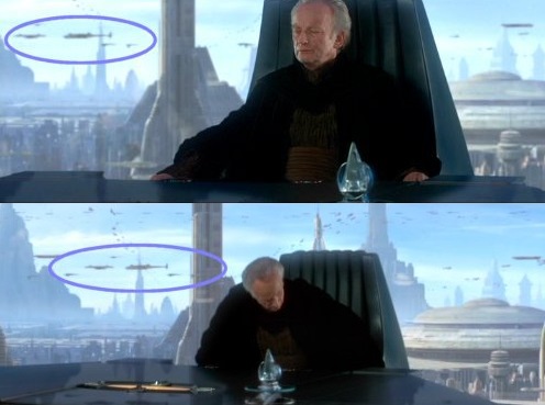 Szczególnie dobrze widać to w jednej z początkowych scen Ataku klonów, gdy Palpatine siedzi przy biurku w swoim gabinecie, na tle szerokiej szyby z widokiem na miasto. Jeśli przypatrzymy się pojazdom w tle dostrzeżemy, że powtarza się wzór, w jakim się poruszają – to zapętlona animacja. Trwa to około trzy minuty.