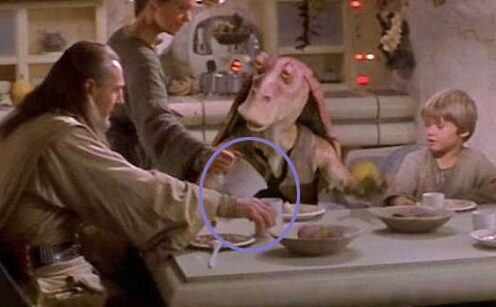 Anakin i jego mama, Shmi, goszczą u siebie Qui-Gon Jinna, Padme i Jar Jar Binksa. W pewnym momencie Shmi nalewa Qui-Gonowi wodę do kubka. Teoretycznie to samo robi w przypadku Jar Jara, jednak gdy się przypatrzymy, zauważymy, że z dzbanka nie wylatuje już ani kropla (co ciekawe, podobna wpadka wystąpiła na polskim rynku… w Klanie). Być może Binks był tak irytujący, że Shmi w ramach zemsty postanowiła go nie poić.