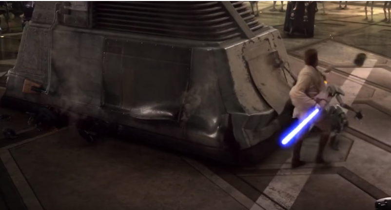 Kenobi nic sobie z tego nie robi i pozbywa się czterech strażników jednocześnie, Mocą ściągając z sufitu sporych rozmiarów element i przygniatając przeciwników (a jednemu z nich dodatkowo odcinając głowę). Użyta przez bohatera Moc musiała być w tamtym momencie szczególnie silna, bo prawdopodobnie samoistnie przesunęła później i wspomniany element sufitu, i znajdujących się pod nim ochroniarzy. Jak inaczej wytłumaczyć jego nieobecność w kolejnych ujęciach? Przecież nie nieuwagą twórców… Zaraz…