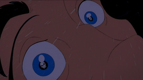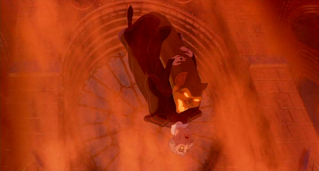 Podczas jednej z pierwszych scen filmu Frollo goni uciekającą Cygankę z zawiniątkiem, przekonany, że coś ukradła. Na schodach katedry kopie bezbronną kobietę i wyrywa jej z rąk tobołek. To matka Quasimoda, która poprzez uderzenie Frolla niefortunnie upada na schody, rozbijając sobie głowę i ginąc na miejscu. Jednak, podobnie jak Skazę, także i jego dopada sprawiedliwość. Pod koniec filmu Frollo umiera, spadając z gargulca zdobiącego katedrę Notre Dame prosto w płomienie, symbolizujące ogień piekielny.