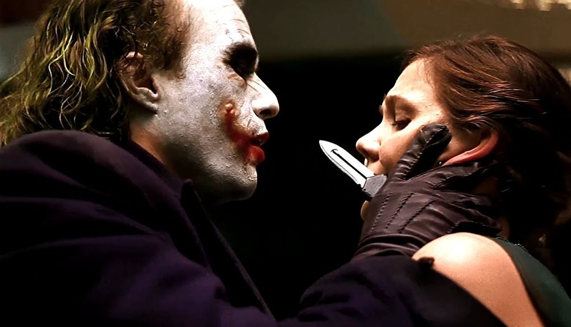 Nie tylko obraz tworzy przerażenie, lecz w wypadku Jokera, którego zagrał Heath Ledger, także to, co mówi i w jaki sposób mówi bohater. Kamera tańczy wokół niego, a on z wyciągniętym w kierunku Rachel nożem recytuje, a może się spowiada? Peszą cię moje blizny? Wiesz, skąd się wzięły? Patrz na mnie. Miałem żonę. Była tak piękna jak ty. Uważała, że za bardzo się martwię. Że powinienem częściej się uśmiechać. Pożyczyła pieniądze od niewłaściwych ludzi.
