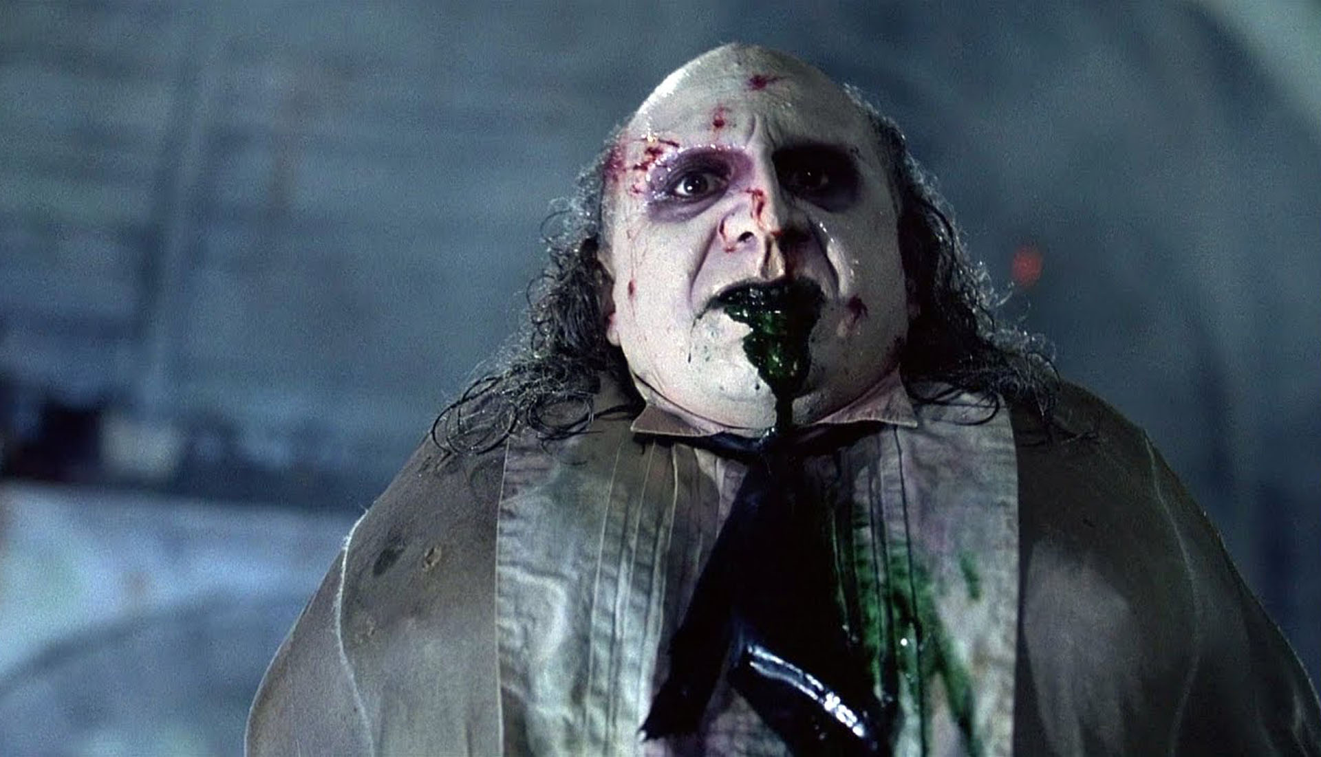Wynurza się z pełnej chemikaliów wody tuż przed oczami patrzącego. Charczy, a z jego ust cieknie gęsta wydzielina o kolorze ciemnej zieleni. Wie, że umiera, ale prze do przodu, żeby wykorzystać ostatnie chwile życia i stać się kimś. Zamordowanie Batmana jest kulminacją jego marnego istnienia. Zamiast jednak sięgnąć po parasol z ukrytym karabinem maszynowym, wyciąga ten, który miał wabić dzieci. Czas mu się nieubłaganie kończy. Kamera pokazuje go z wszystkimi odstręczającymi detalami, żebyśmy widzieli, jak się męczy, jak cierpi. W końcu upada na twarz, a po chwili zjawiają się pingwiny, by odprowadzić go w jego ostatnią drogę.