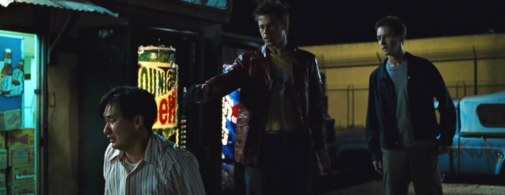 Również w wypadku fincherowskiego Fight Clubu siłę napędową stanowiło uczucie satysfakcji. Poczucie bycia lepszym niż motłoch bezbarwnych metroseksualistów, niespełnionych sprzedawców opon, naukowców, nauczycieli wciąż od kogoś zależnych. Im bardziej jednak stowarzyszenie się rozrasta, tym bardziej sprawy zaczynają się komplikować. A my po raz pierwszy demaskujemy podwójną osobowość przywódcy „Podziemnego kręgu„: naszym oczom ukazuje się dziwaczna hybryda, składająca się z zagubionego konsumenta i przebojowego Tylera.