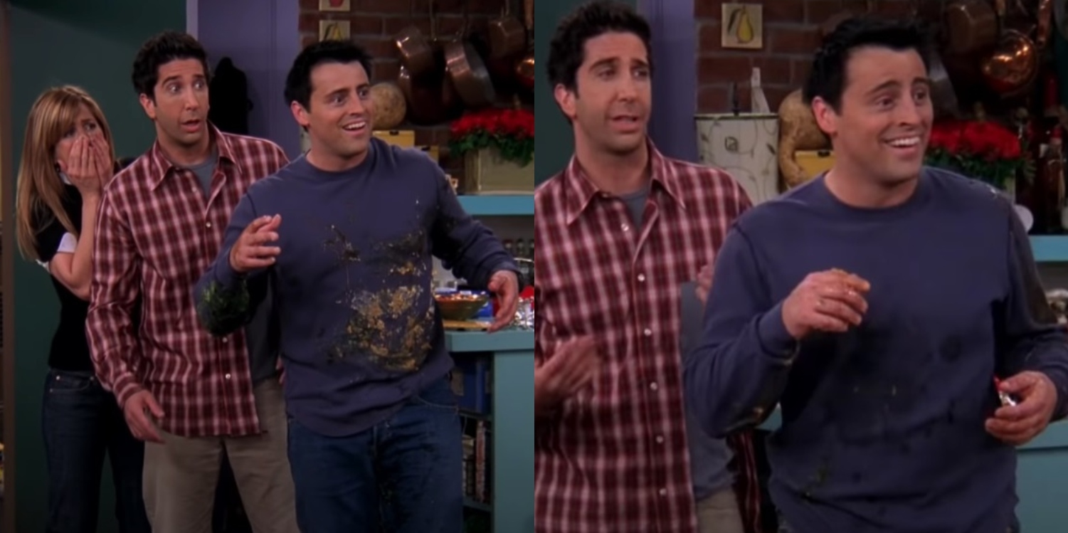 Na koniec jeszcze jedna wpadka z brudnym ubraniem – tym razem chodzi o Joeya, który w zależności od ujęcia ma sweter cały w plamach od jedzenia, którym się wcześniej zalał, lub znacznie czystszy. Sytuacja ma miejsce w odcinku The One with the Late Thanksgiving, w którym Chandler i Monica dowiadują się, że będą mogli zaadoptować dziecko.