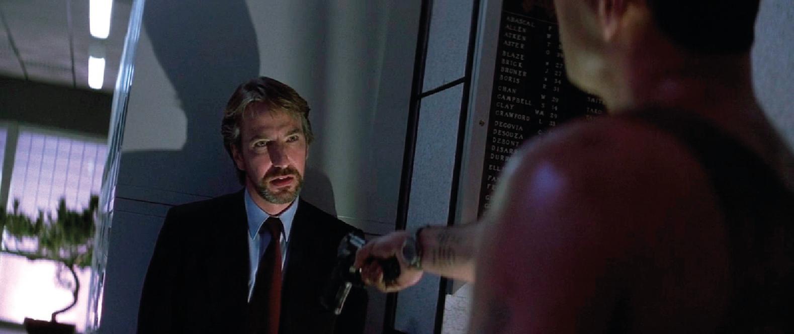 Hans Gruber ze swoimi ludźmi opanował wieżowiec Nakatomi i przez długi czas był pewien, że jest panem sytuacji. Pojawił się jednak kamień w bucie, ość w gardle w postaci pewnego zwyczajnie niezwyczajnego gliniarza z Nowego Yorku, który odwiedził żonę w Boże Narodzenie. Hans zapuścił się w rejony budynku bez obstawy, żeby sprawdzić ładunki wybuchowe i został zaskoczony przez Johna. Gruber, udając jednego z gości wziętego za zakładnika, wdaje się w luźną pogawędkę z McClanem niczym z kumplem ze szkoły. Znajdują wspólny język, a widz ma wrażenie, że nowojorski łaps rzeczywiście dał się nabrać przebiegłemu przeciwnikowi, który uśmiecha się fałszywie, ale gdyby tylko był uzbrojony, wpakowałby cały magazynek w pozornie nieświadomego Johna. W tej sekwencji występuje pewna doza humoru sytuacyjnego, lecz doprawiona odpowiednim napięciem, kiedy John w geście zaufania daje Hansowi broń…