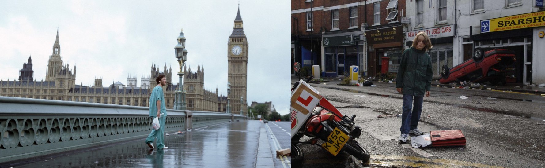 Stolica Anglii dwukrotnie została przez rodzimych filmowców zamieniona w wyludnione pole do popisu dla nielicznych, którym udało się jakoś przetrwać nagły atak agresywnej choroby zmieniającej ludzi w bezmyślnych krwiożerców. W oryginalnym filmie wymarłe ulice Londynu dosłownie straszyły swą wymownością oraz szorstkim ujęciem kamery. W widowiskowej kontynuacji z kolei imponowały surowym pięknem i skalą pustostanu. Wspólnie to zdecydowana czołówka w temacie.