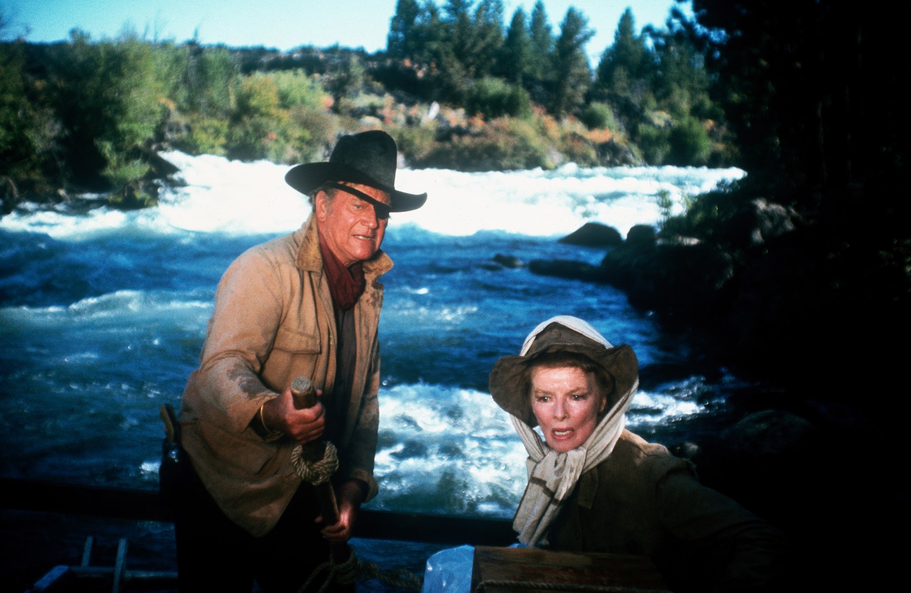 Tenże czar tkwi głównie w duecie głównych bohaterów – znanego nam już z Prawdziwego męstwa tytułowego szeryfa z przepaską na oku, którego brak przyniósł Johnowi Wayne’owi jedynego Oscara w karierze, oraz zadziornej panny Euli, czyli kolejnej ekranowej inkarnacji nieprzejednanego charakteru Katharine Hepburn. Te dwie podstarzałe legendy kina – w dodatku równolatkowie – pojawiły się tu po raz pierwszy i jedyny wspólnie na ekranie, co mogło w sumie stanowić małe święto dla miłośników X muzy, a na pewno było (i pozostaje) specyficznym pojedynkiem twardych i jakże odmiennych od siebie osobowości.